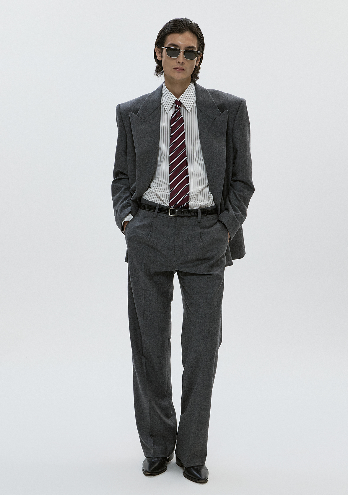 - Masculine lapel shape and a firm, structured silhouette